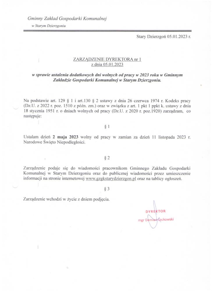 Zarządzenie dni wolne 2023